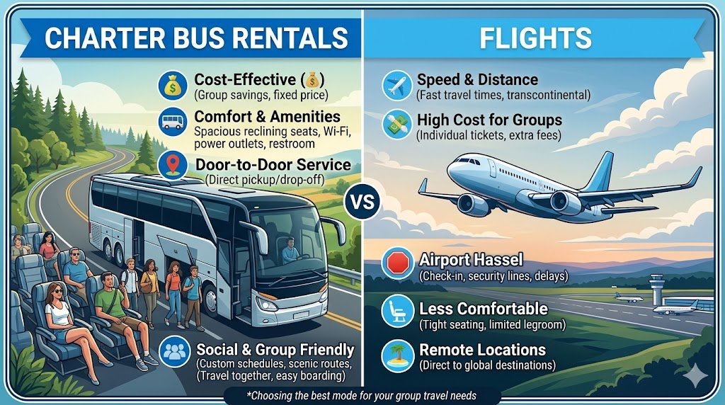 Benefits of Charter Bus Rentals vs. Flights: Which Is Better for Group Travel?