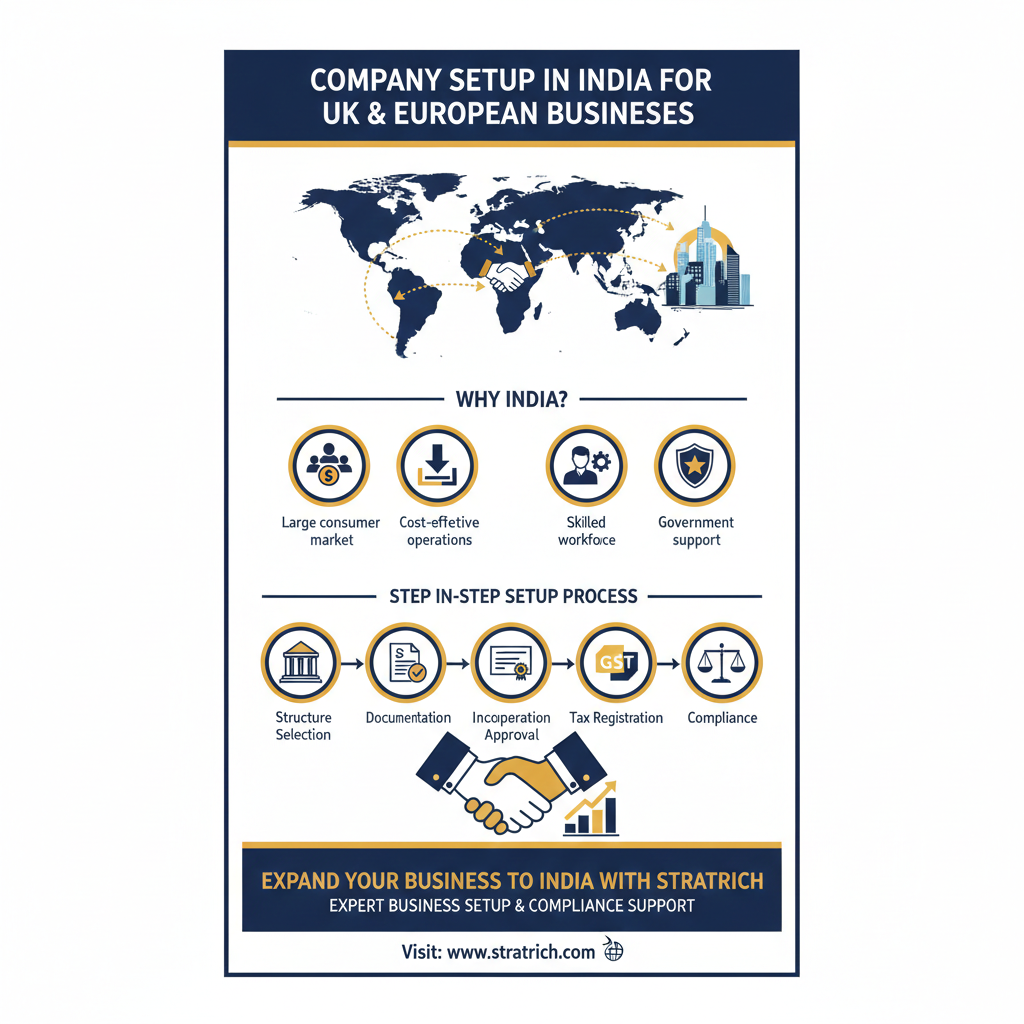For businesses planning to enter the Indian market, understanding the legal framework, registration process, and compliance requirements is essential. This guide explains everything UK and European entrepreneurs need to know about setting up a company in India and how professional consultancy services like Stratrich can simplify the journey.