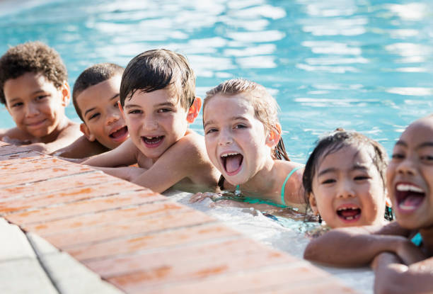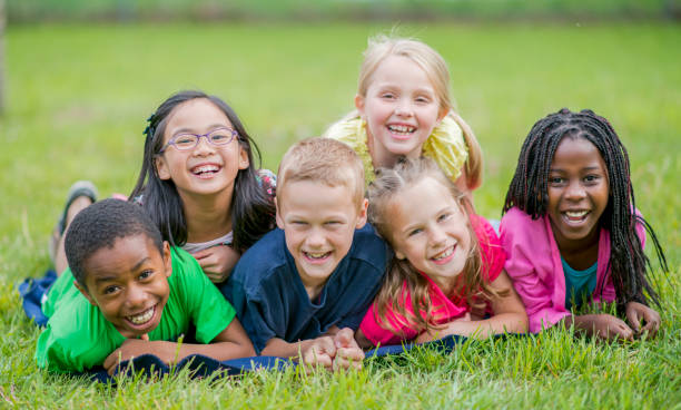 A group of children are jumping in excitement as they are getting ready with their camp counsellors to play a game of tug-of-war at summer camp.